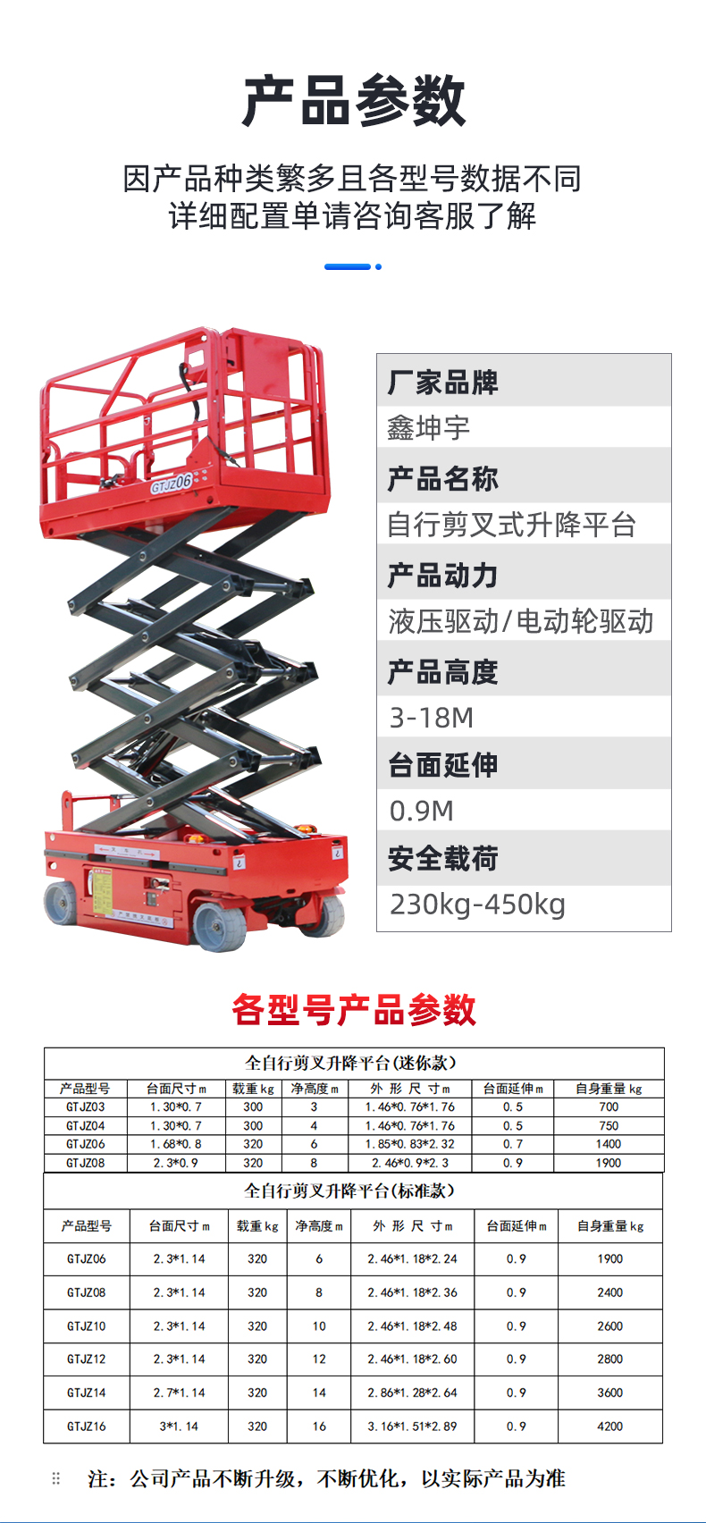自行走升降机小6米是一种适用于多种高空作业场景的机械设备,具有自行走能力,无需外接电源或动力源,即可在作业区域内自由移动。此款电动升降平台是自行式升降机升高6米载重300KG,具有升降稳定,行走自如等特点。